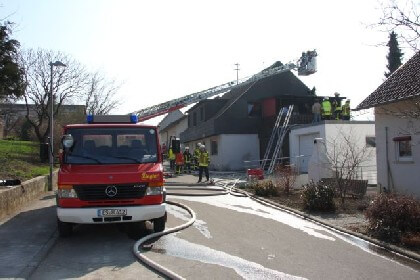 Mit einem weiteren C-Rohr über die Drehleiter der mitalarmierten Weilheimer Feuerwehr konnte verhindert werden, dass sich das Feuer über den Dachstuhl ausbreitet.