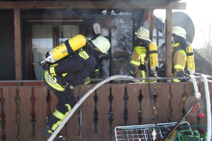 Die Eternit-Verkleidung vom Gebäude wurde im Bereich des Balkons abgelöst, um Glutnester abzulöschen.