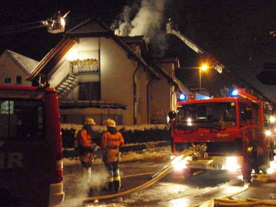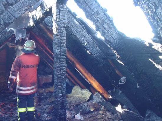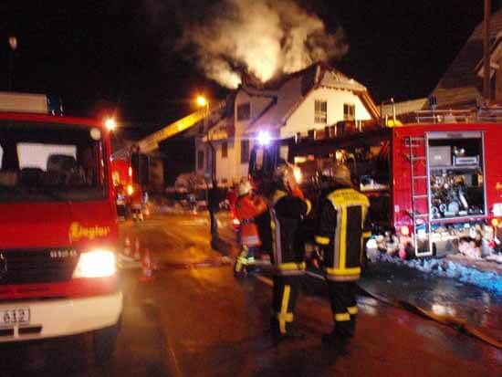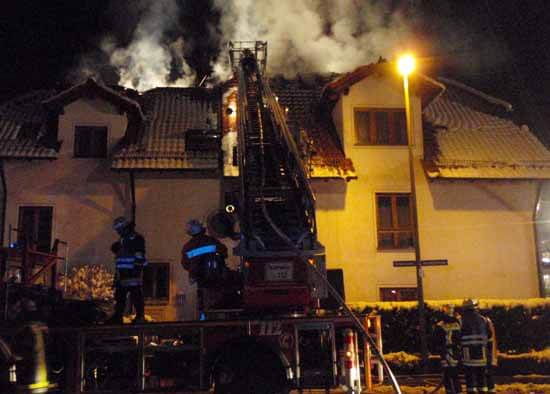 Währenddessen wurde der Dachstuhlbrand von Atemschutztrupps im Innenangriff und von außen über die Drehleitern von Kirchheim und Nürtingen bekämpft, so dass das Feuer nach anderthalb Stunden weitestgehend gelöscht war. Allerdings waren im Gebälk immer noch zahlreiche immer wieder aufflammende Glutnester vorhanden, die bewirkten, dass sich die Löscharbeiten noch bis 5.00 Uhr hinzogen.
