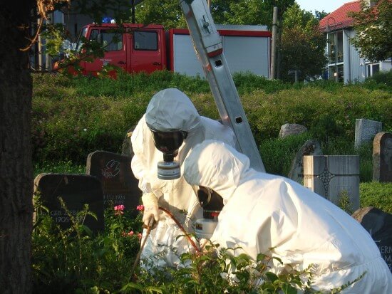 Die Feuerwehr war mit vier Mann und einem Fahrzeug im Einsatz. Bei dieser Art von Einsatz wird zum Eigenschutz eine spezielle Schutzkleidung getragen.