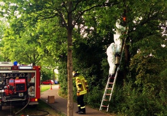 Die Feuerwehr wurde am 10. Juni gegen 19.00 Uhr zur Entfernung von Eichenprozessionsspinnern in die Friedhofstraße gerufen. Dort war ein Baum mit einem großen Nest der Raupen behangen. Die feinen Härchen der Raupen können bei Berührung heftige Reizungen der Haut, Augen und Atemwege bis hin zu einem allergischen Schock auslösen. Daher wurde das Raupennest oberhalb des Friedhofes entfernt. Die Feuerwehr war mit vier Mann im Einsatz. Zum Eigenschutz vor den Härchen der Raupen wurde eine spezielle Schutzkleidung getragen.