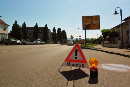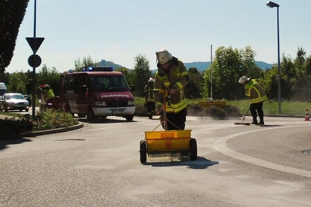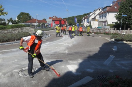 Im Bereich des Kreisverkehrs war die Fahrbahn mit Dieselkraftstoff verunreinigt. Aufgrund der Fahrbahnverschmutzung stürzte ein Motorradfahrer und alarmierte nachfolgend selbst die Feuerwehr per Notruf 112. Glücklicherweise überstand der  Motorradfahrer den Sturz unverletzt.