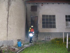 Beim Eintreffen der Feuerwehr war starker Rauch im Bereich der Eingangstür zu einem Seitenanbau des Wohngebäudes und in den dahinter liegenden Lagerräumen erkennbar. Von einer brennenden Holztreppe im Eingangsbereich breiteten sich die Flammen sich auf die Tür zu den Lagerräumen aus.