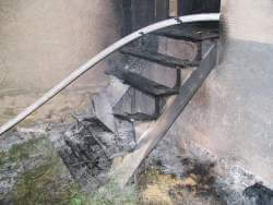Die Treppe und Tür wurden abgelöscht, und das verrauchte Gebäude unter Atemschutz nach evtl. weiteren Glutnestern abgesucht.
