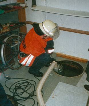 Die Wehr war mit 11 Mann im Einsatz. Mit einer Tauchpumpe wurde das immer wieder nachfließende Wasser abgepumpt.