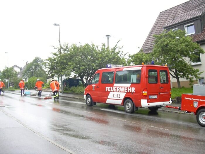 Ein unbekanntes Fahrzeug hat an mehreren Stellen in der Aichelberger Straße Dieselkraftstoff verloren, der durch den Regen zu großen schmierigen Flächen auf der Fahrbahn aufgeschwemmt wurde. Die sieben Einsatzkräfte der Holzmadener Feuerwehr haben die Rutschgefahr für andere Verkehrsteilnehmer und die Gefahr für die Umwelt, mittels Ölbinder, schnell beseitig. Der Straßenverlauf wurde zusätzlich mit Hinweisschildern „ÖLSPUR“ abgesichert.