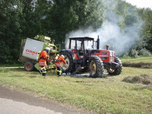 Ein beim Heupressen in Brand geratener Traktor stand beim Eintreffen der Feuerwehr bereits im Vollbrand und wurde mit Schaum abgelöscht.